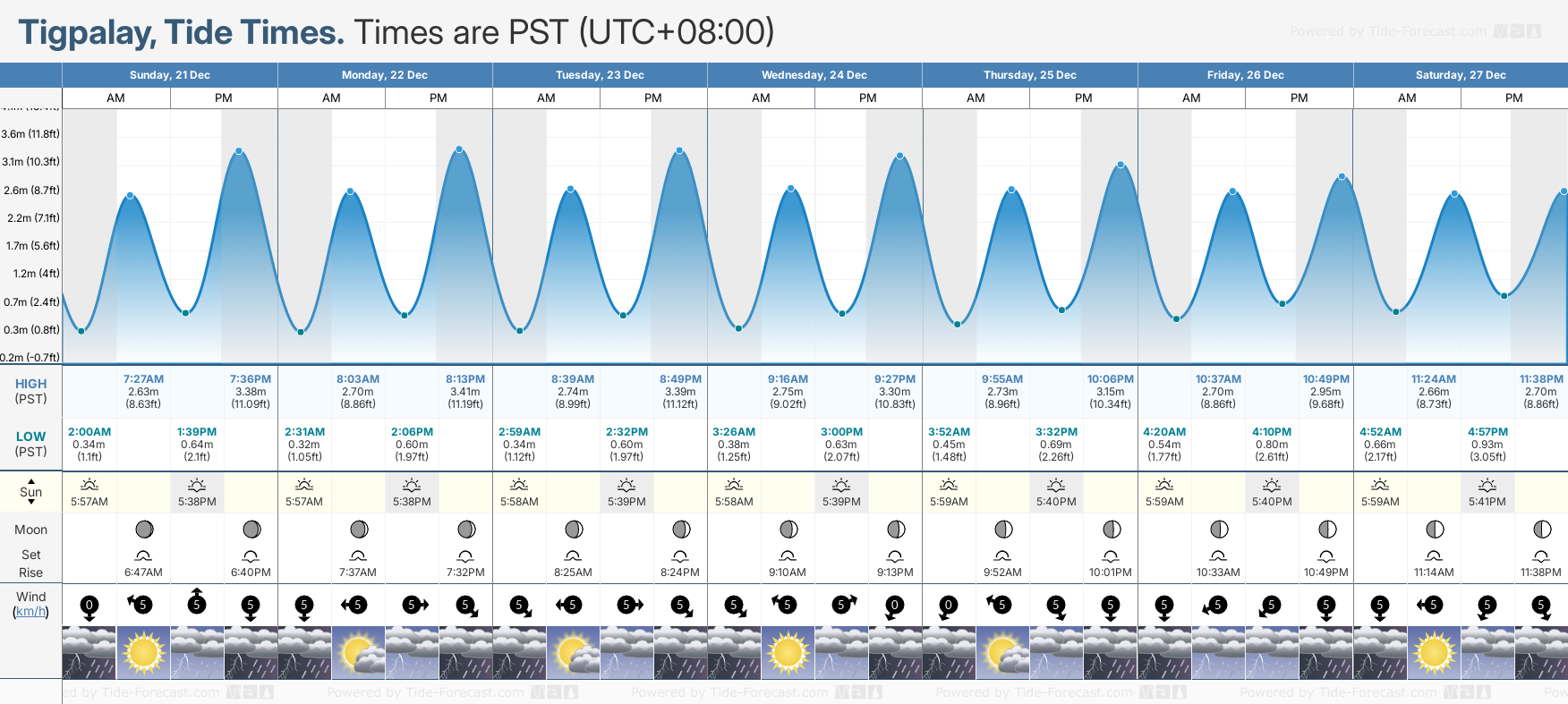 Tide Times are PST (UTC +8.0hrs). Last Spring High Tide at Tigpalay was on Sun 07 Dec (height: 3.75m 12.3ft). Next high Spring Tide at Tigpalay will be on Tue 23 Dec (height: 3.41m 11.2ft).