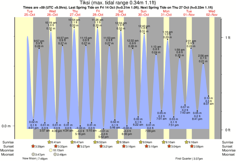 Tide Times are +09 (UTC +9.0hrs). Last Spring High Tide at Tiksi was on Sun 07 Dec (height: 0.31m 1.0ft). Next high Spring Tide at Tiksi will be on Mon 22 Dec (height: 0.32m 1.0ft).
