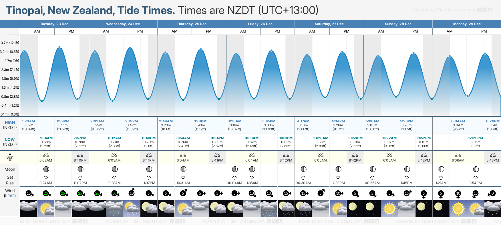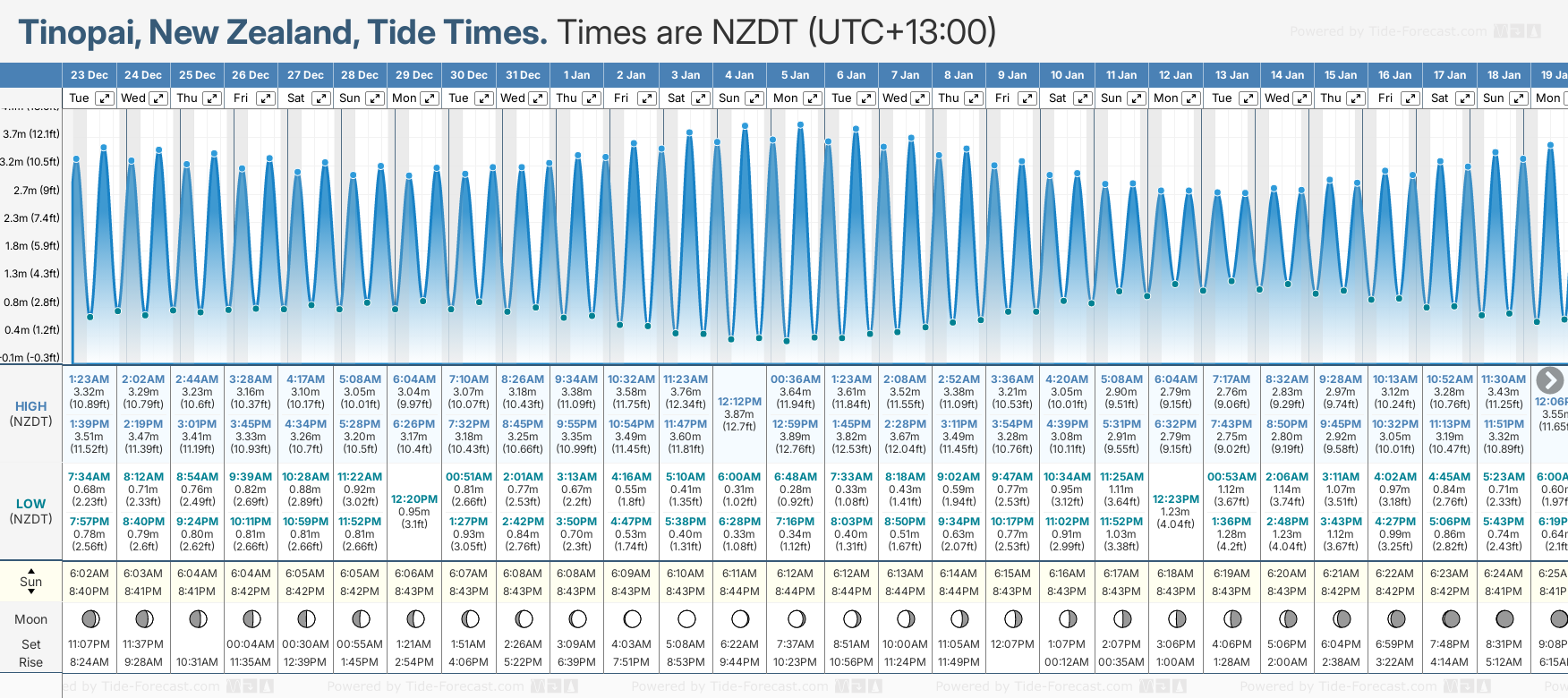 December and January Tide charts for Tinopai: The tide charts below show the height, time and date of high and low tides for the next 30 days.