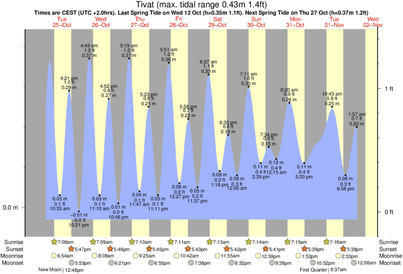 Tide Times are CET (UTC +1.0hrs). Last Spring High Tide at Tivat was on Fri 05 Dec (height: 0.39m 1.3ft). Next high Spring Tide at Tivat will be on Sun 21 Dec (height: 0.36m 1.2ft).