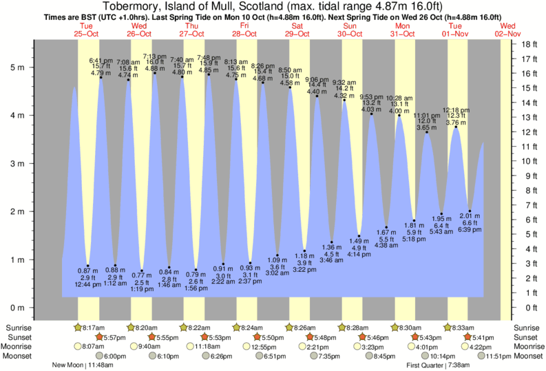 Tobermory, Island of Mull tide chart key: The tide chart above shows the height and times of high tide and low tide for Tobermory, Island of Mull, Scotland. The grey shading corresponds to nighttime hours between sunset and sunrise at Tobermory, Island of Mull.
