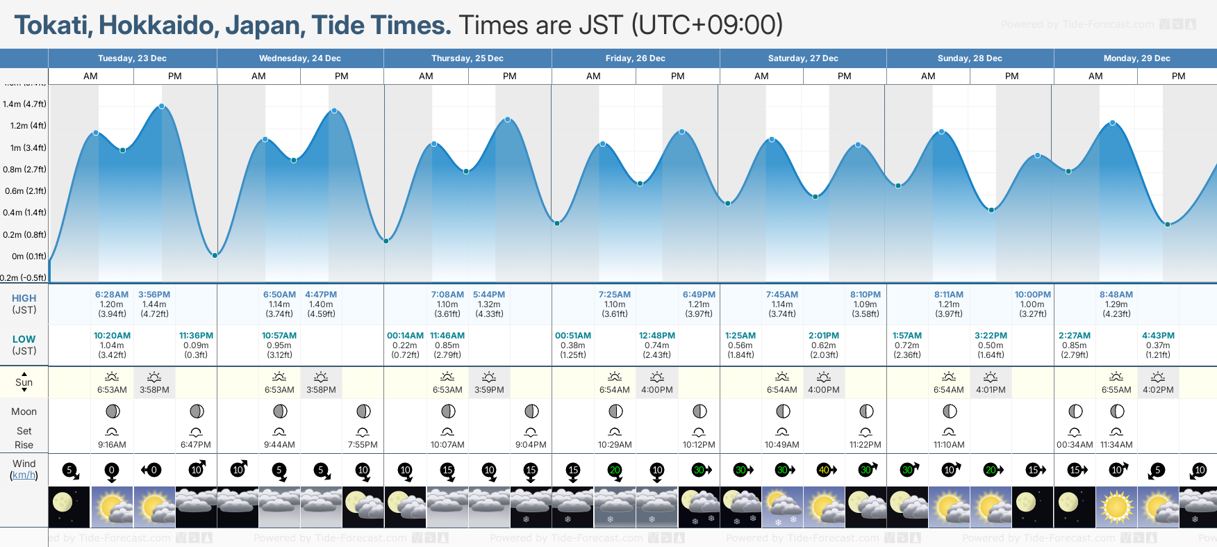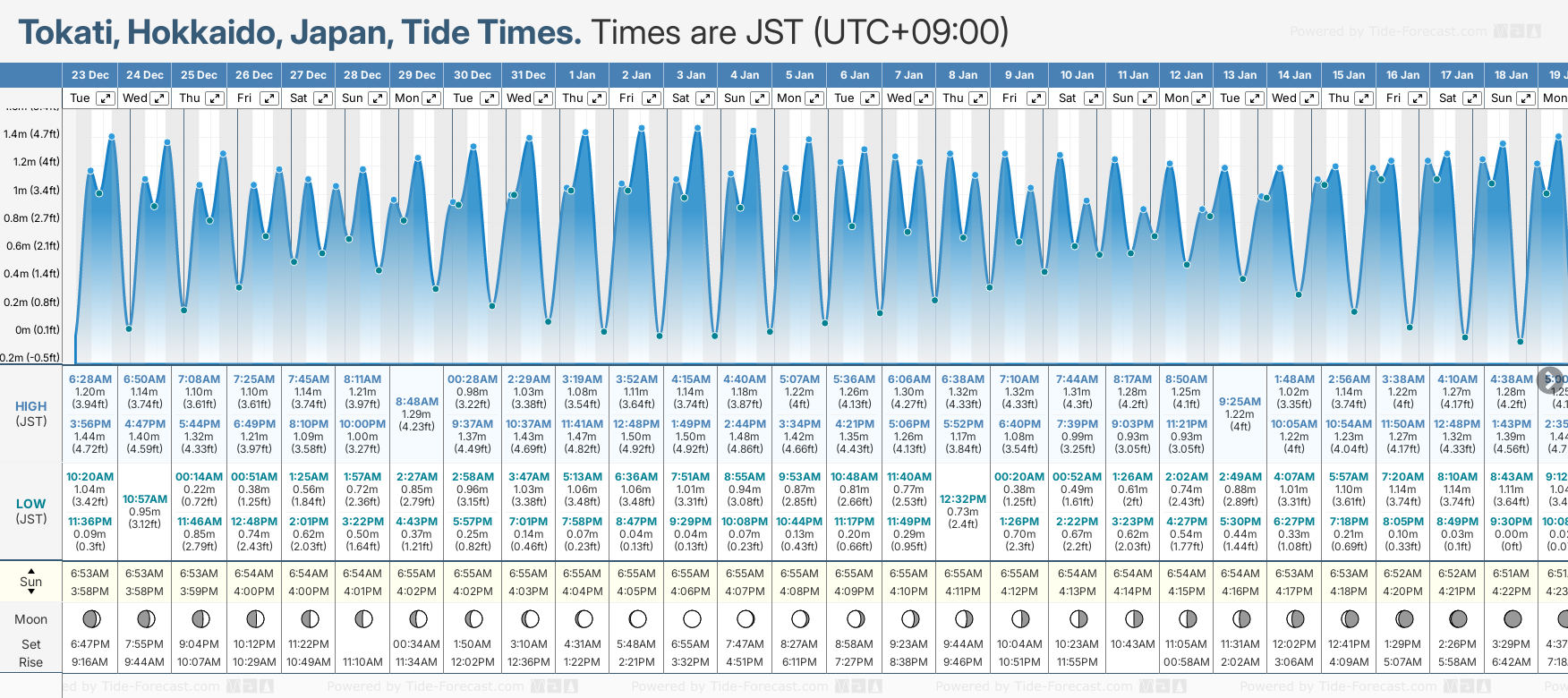 Tide Times are JST (UTC +9.0hrs). Last Spring High Tide at Tokati was on Sun 14 Dec (height: 1.24m 4.1ft). Next high Spring Tide at Tokati will be on Tue 23 Dec (height: 1.44m 4.7ft).