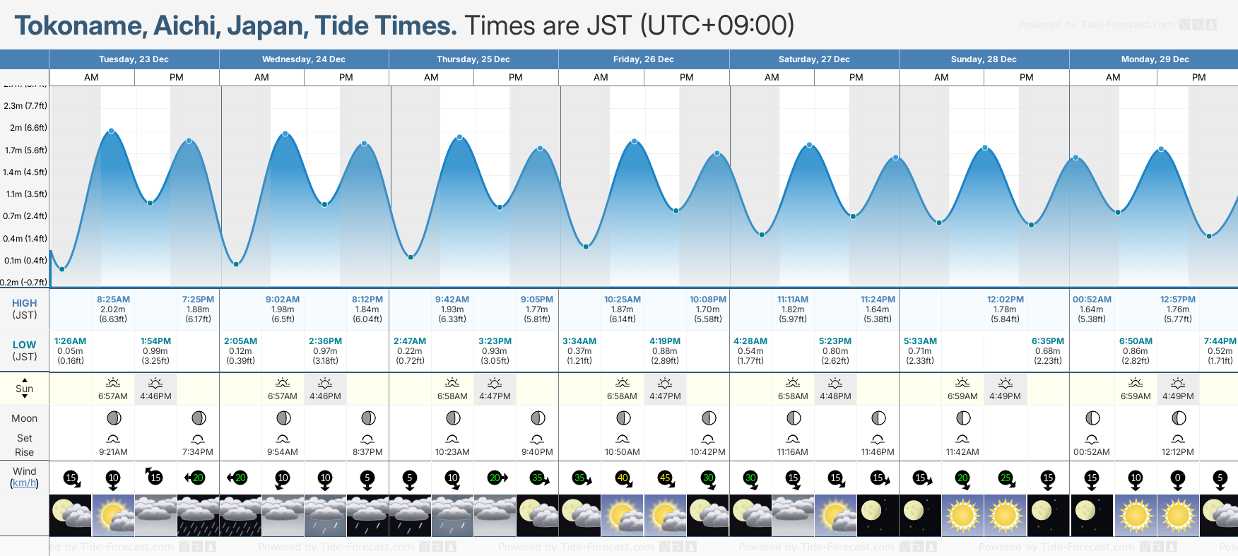 December and January Tide charts for Tokoname: The tide charts below show the height, time and date of high and low tides for the next 30 days.