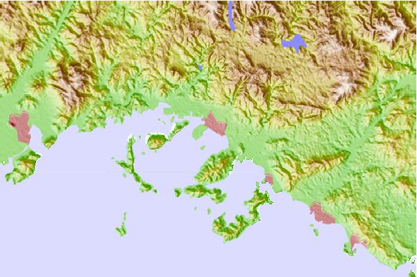 Use this relief map to navigate to tide stations, surf breaks and cities that are in the area of Tokuyama, Yamaguti, Japan.