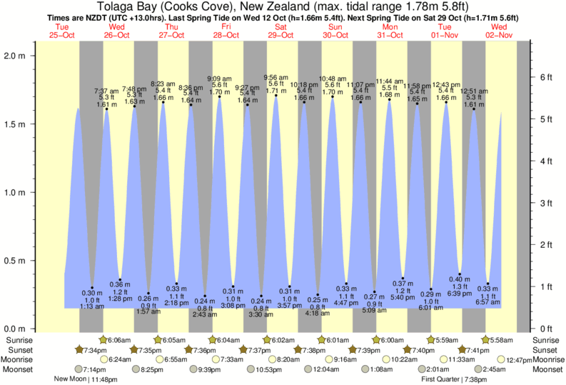 Tide chart for Tolaga Bay (Cooks Cove)Showing low and high tide times for the next 30 days at Tolaga Bay (Cooks Cove). Tide Times are NZDT (UTC +13.0hrs).