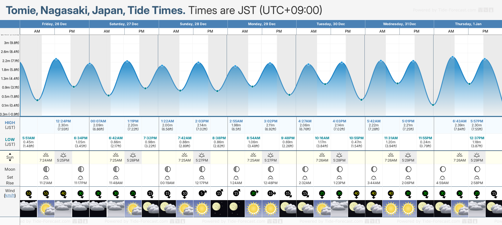 Tide Times are JST (UTC +9.0hrs). Last Spring High Tide at Tomie was on Mon 22 Dec (height: 2.57m 8.4ft). Next high Spring Tide at Tomie will be on Mon 05 Jan (height: 2.74m 9.0ft).