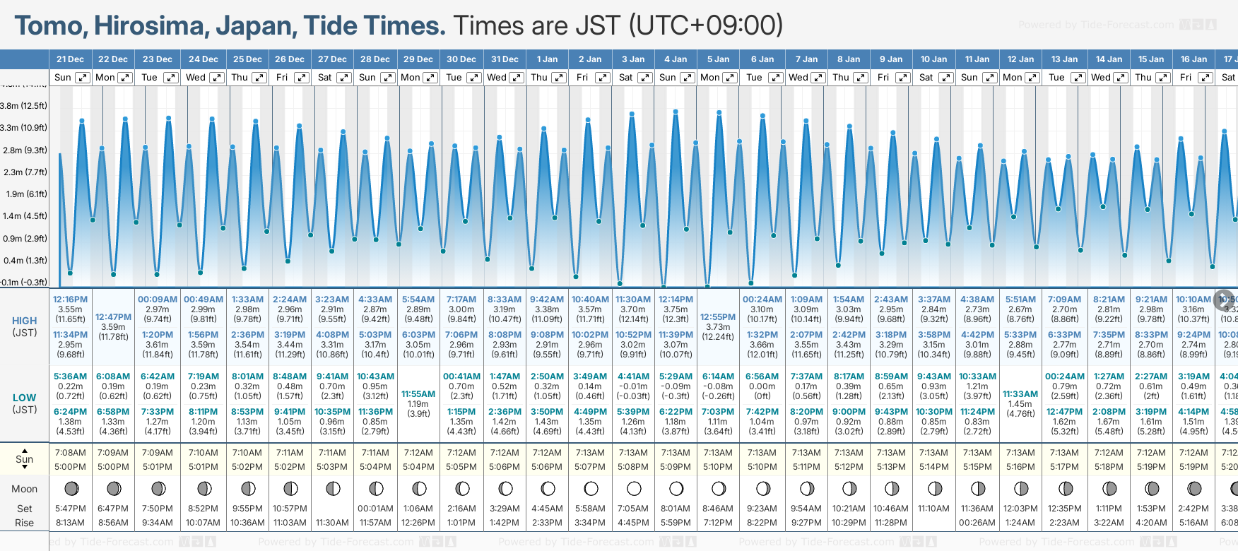 December and January Tide charts for Tomo: The tide charts below show the height, time and date of high and low tides for the next 30 days.
