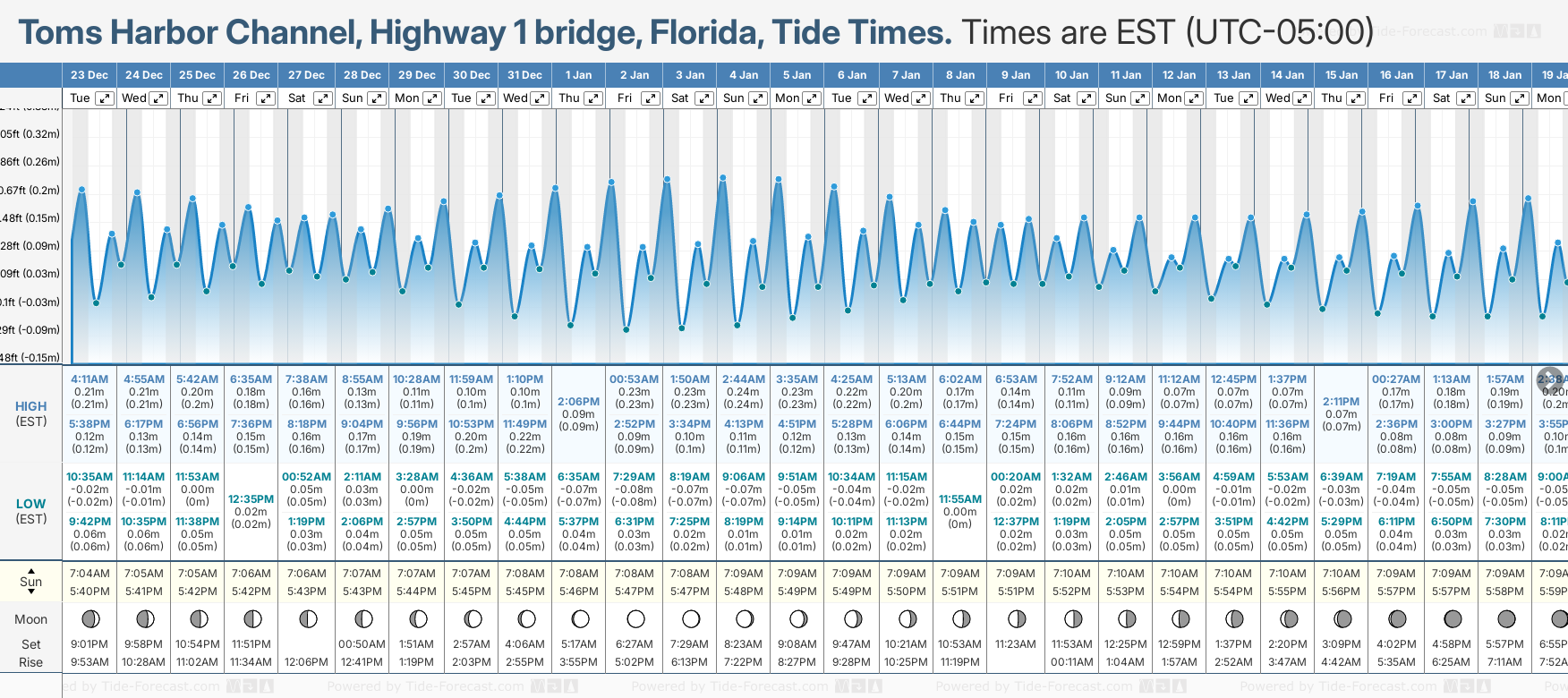 December and January Tide charts for Toms Harbor Channel, Highway 1 bridge: The tide charts below show the height, time and date of high and low tides for the next 30 days.