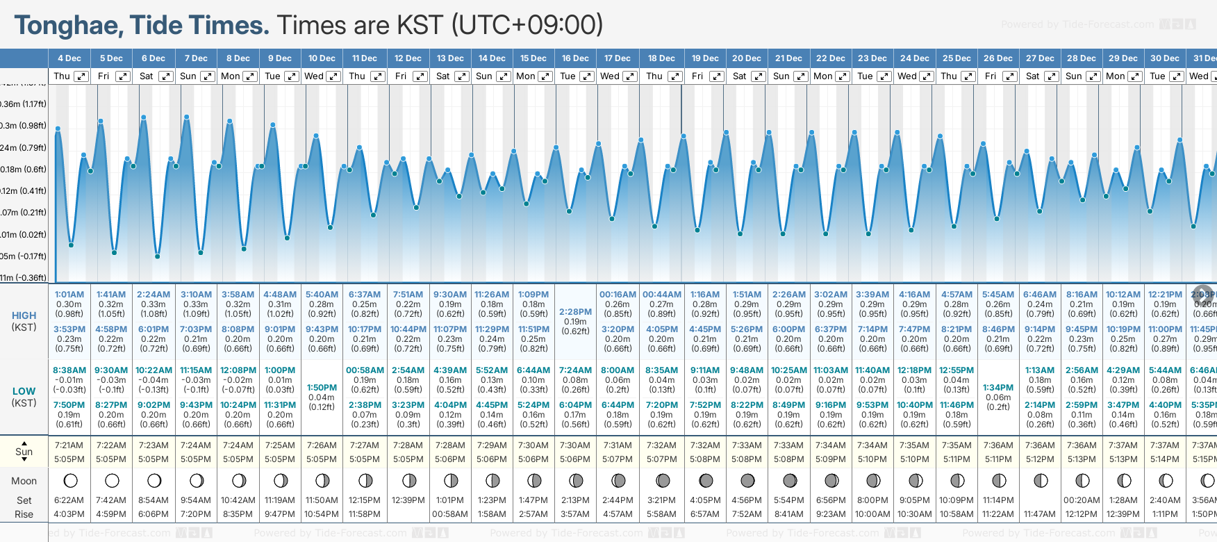 December Tide charts for Tonghae: The tide charts below show the height, time and date of high and low tides for the next 30 days.