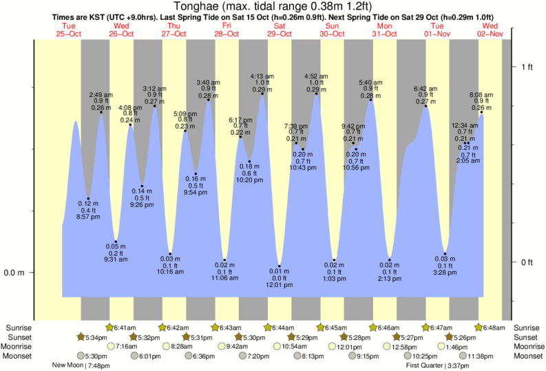 Tide Times are KST (UTC +9.0hrs). Last Spring High Tide at Tonghae was on Sat 20 Dec (height: 0.29m 1.0ft). Next high Spring Tide at Tonghae will be on Sat 03 Jan (height: 0.33m 1.1ft).