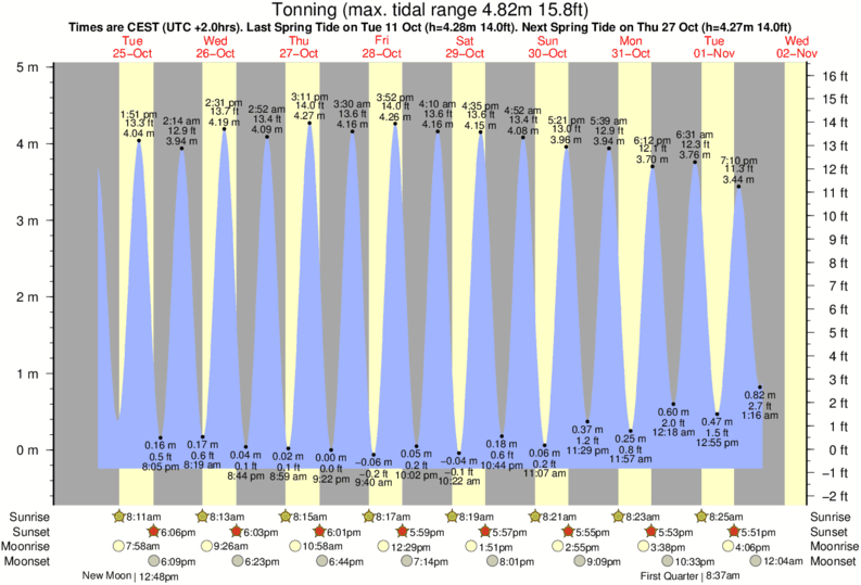 Tide Times are CET (UTC +1.0hrs). Last Spring High Tide at Tonning was on Mon 08 Dec (height: 4.37m 14.3ft). Next high Spring Tide at Tonning will be on Thu 25 Dec (height: 4.03m 13.2ft).