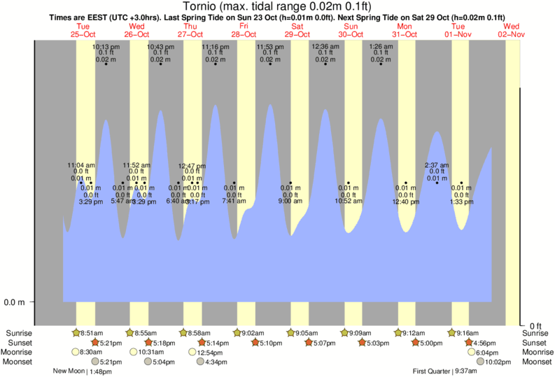 Tide Times are EET (UTC +2.0hrs). Last Spring High Tide at Tornio was on Thu 18 Dec (height: 0.02m 0.1ft). Next high Spring Tide at Tornio will be on Sat 27 Dec (height: 0.01m 0.0ft).