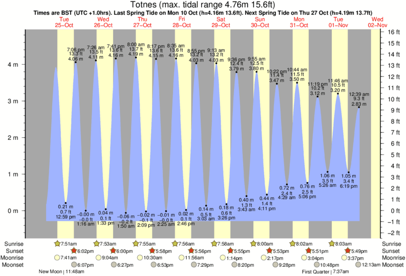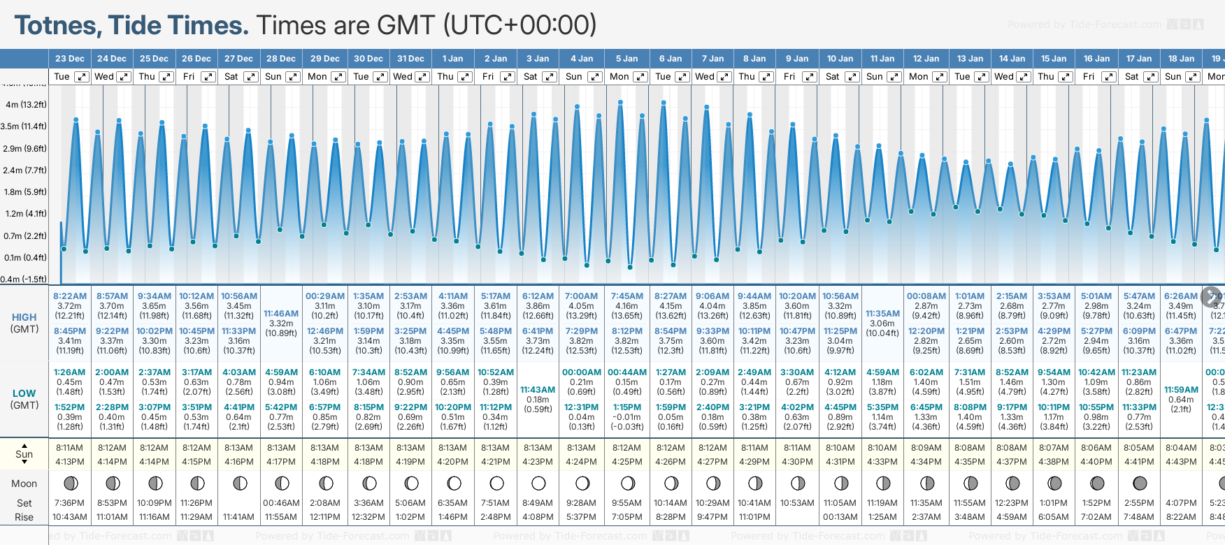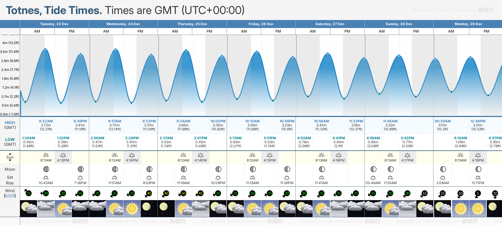 December and January Tide charts for Totnes: The tide charts below show the height, time and date of high and low tides for the next 30 days.