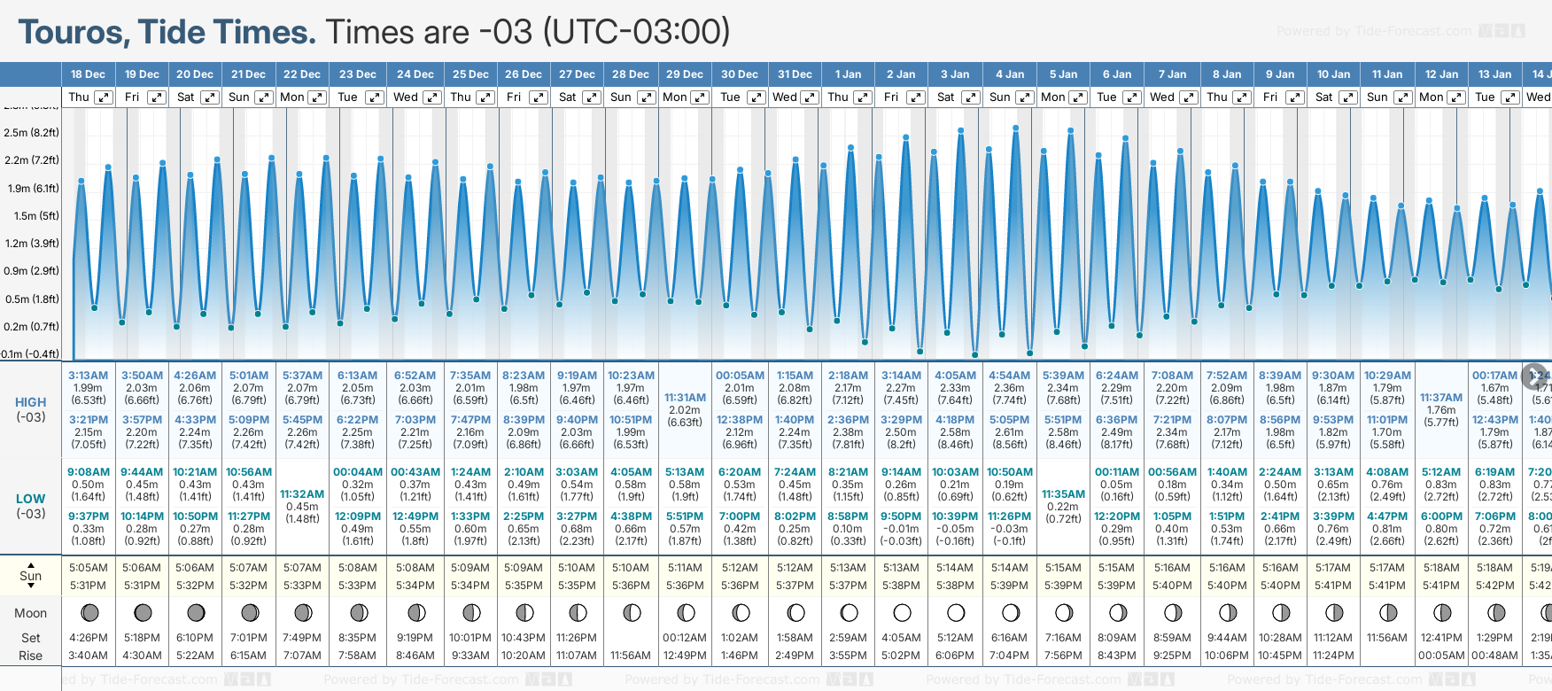 December and January Tide charts for Touros: The tide charts below show the height, time and date of high and low tides for the next 30 days.