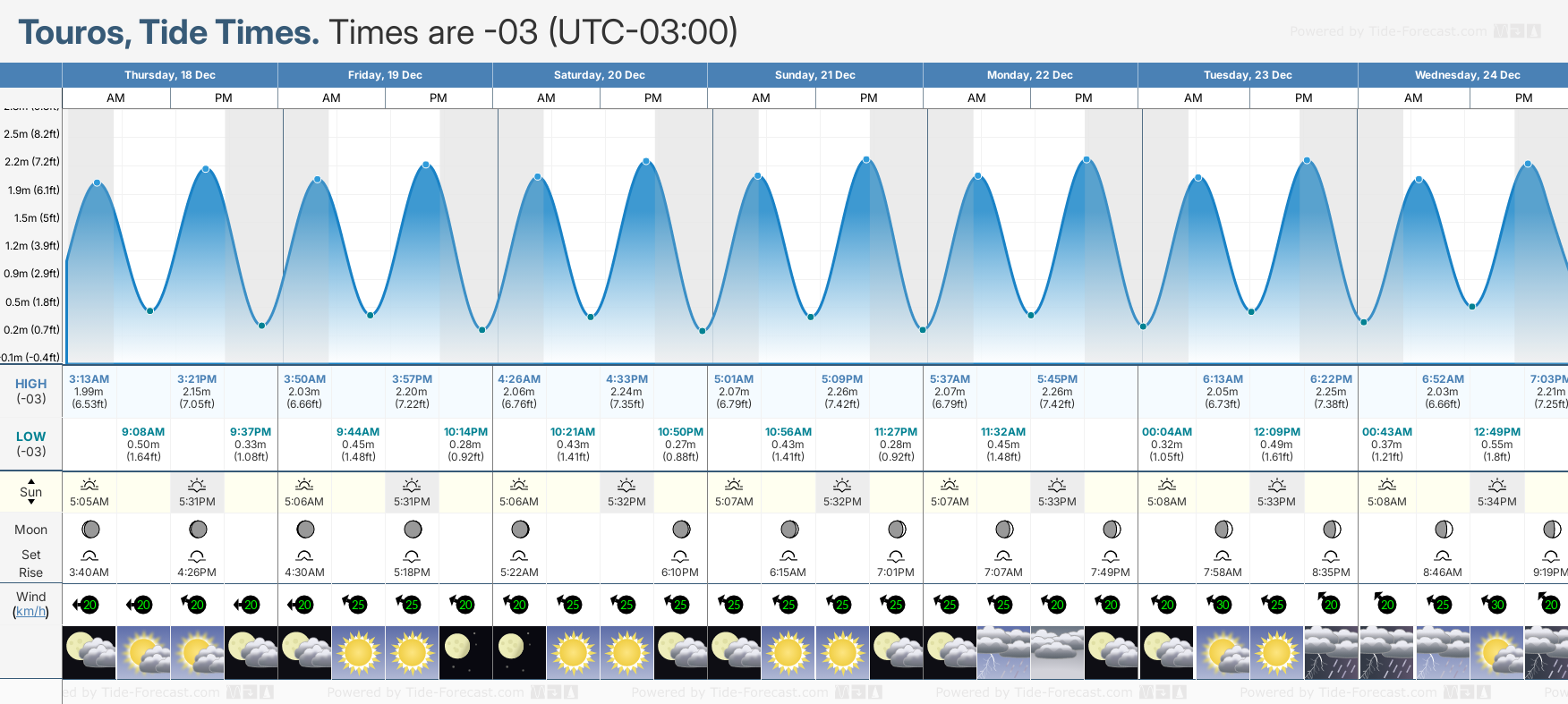 Tide Times are -03 (UTC -3.0hrs). Last Spring High Tide at Touros was on Fri 05 Dec (height: 2.60m 8.5ft). Next high Spring Tide at Touros will be on Sun 21 Dec (height: 2.26m 7.4ft).