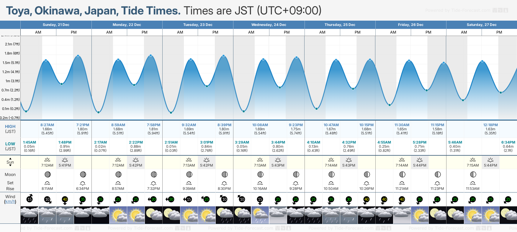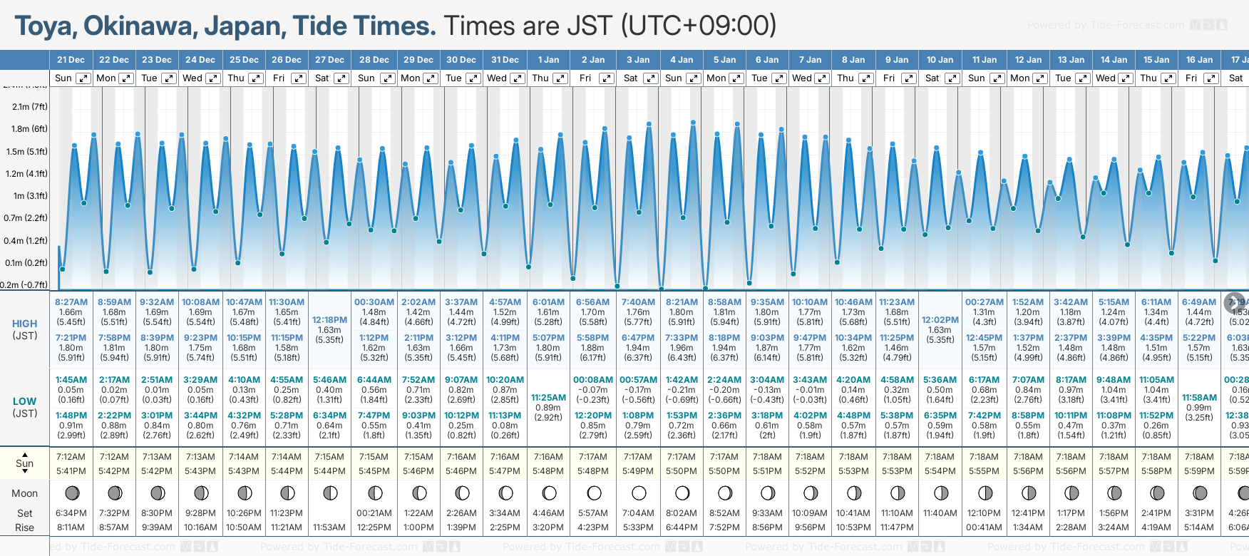Tide Times are JST (UTC +9.0hrs). Last Spring High Tide at Toya was on Sun 07 Dec (height: 2.04m 6.7ft). Next high Spring Tide at Toya will be on Tue 23 Dec (height: 1.81m 5.9ft).