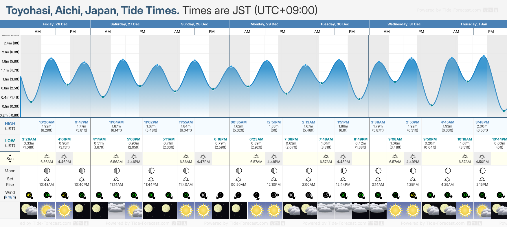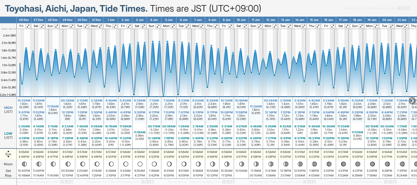 December and January Tide charts for Toyohasi: The tide charts below show the height, time and date of high and low tides for the next 30 days.