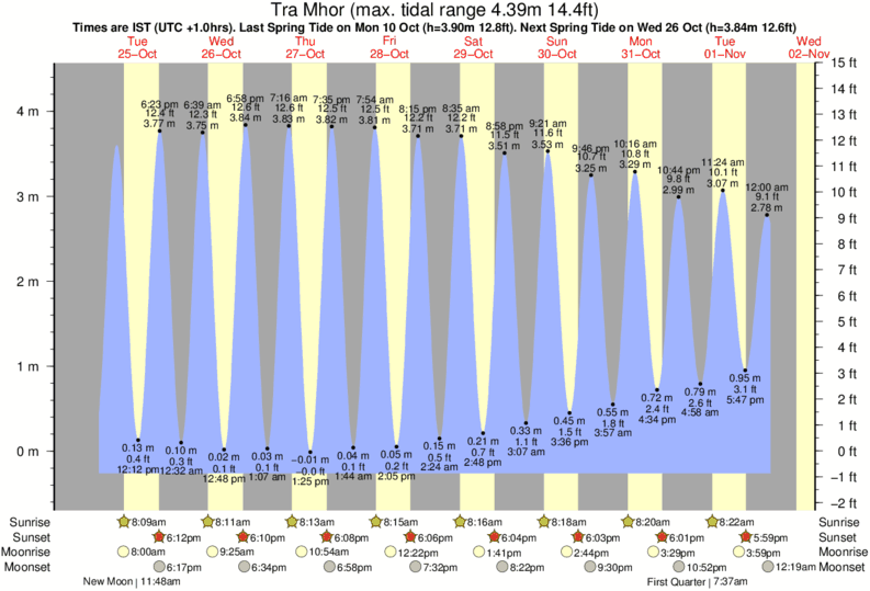 Tide Times are IST (UTC +0hrs). Last Spring High Tide at Tra Mhor was on Sat 06 Dec (height: 3.88m 12.7ft). Next high Spring Tide at Tra Mhor will be on Mon 22 Dec (height: 3.40m 11.2ft).