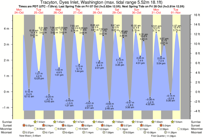 Tracyton, Dyes Inlet tide chart key: The tide chart above shows the height and times of high tide and low tide for Tracyton, Dyes Inlet, Washington. The grey shading corresponds to nighttime hours between sunset and sunrise at Tracyton, Dyes Inlet.