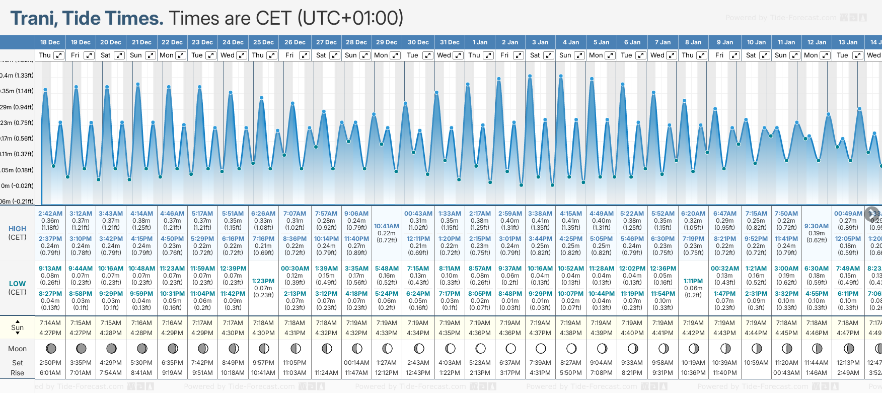 December and January Tide charts for Trani: The tide charts below show the height, time and date of high and low tides for the next 30 days.
