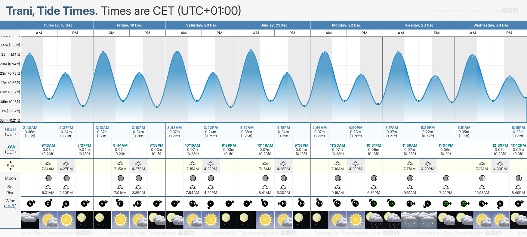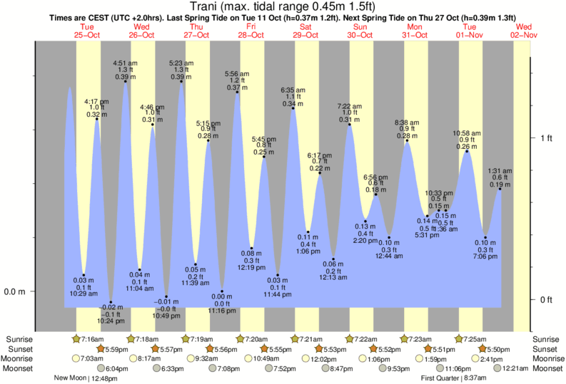 Tide Times are CET (UTC +1.0hrs). Last Spring High Tide at Trani was on Fri 05 Dec (height: 0.41m 1.3ft). Next high Spring Tide at Trani will be on Sun 21 Dec (height: 0.38m 1.2ft).