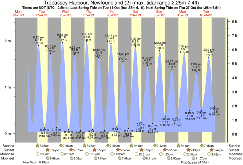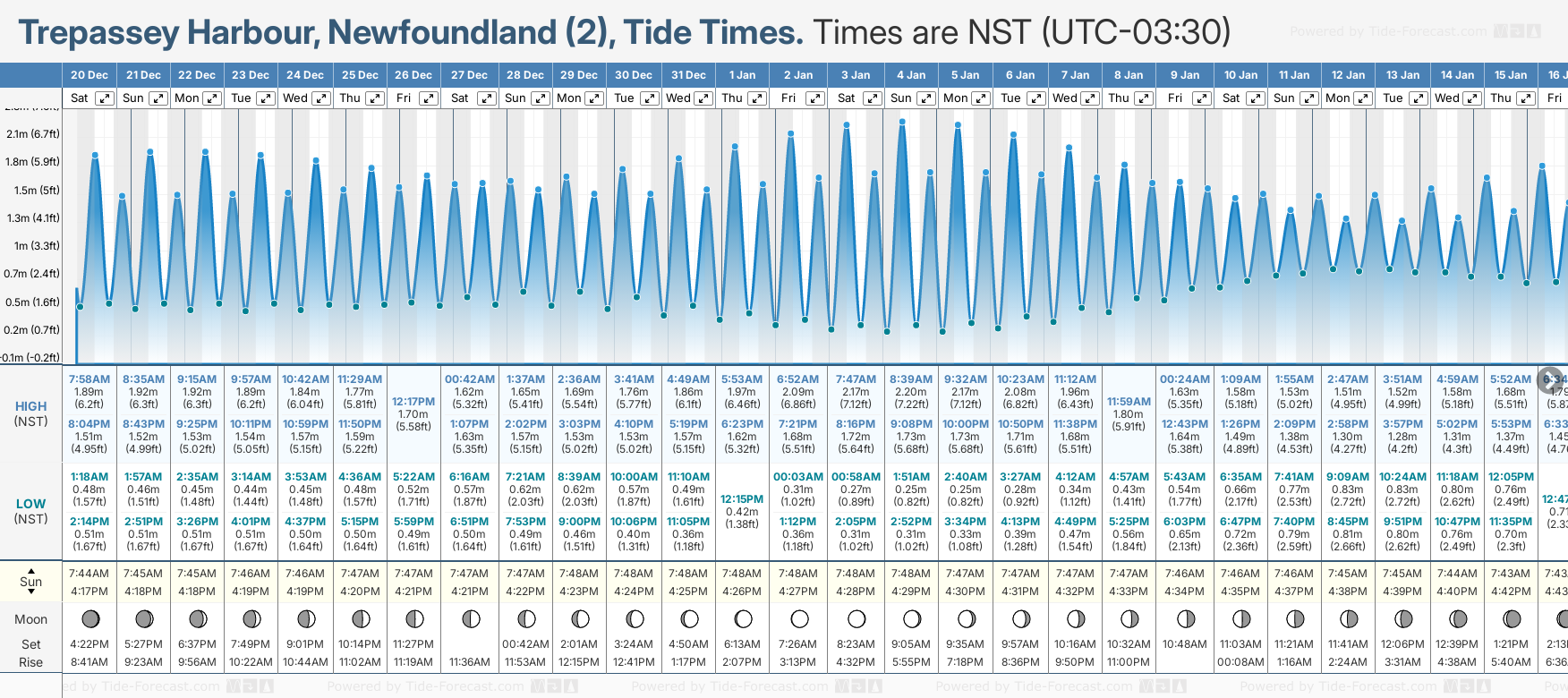 Tide chart for Trepassey Harbour (2)Showing low and high tide times for the next 30 days at Trepassey Harbour (2). Tide Times are NST (UTC -3.5hrs).
