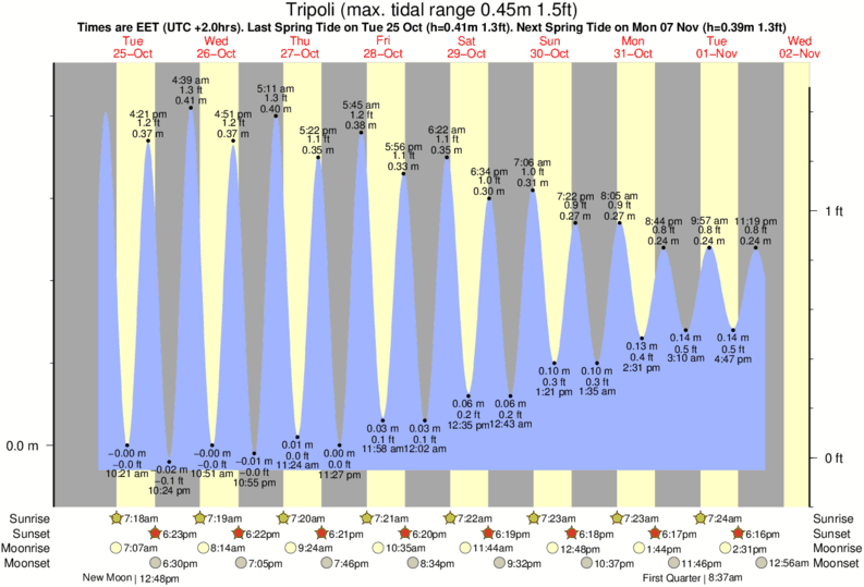 Tide Times are EET (UTC +2.0hrs). Last Spring High Tide at Tripoli was on Sun 21 Dec (height: 0.35m 1.1ft). Next high Spring Tide at Tripoli will be on Sun 04 Jan (height: 0.38m 1.2ft).