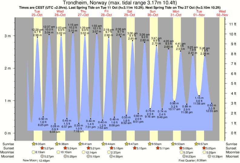 Tide Times are CET (UTC +1.0hrs). Last Spring High Tide at Trondheim was on Sat 06 Dec (height: 3.10m 10.2ft). Next high Spring Tide at Trondheim will be on Mon 22 Dec (height: 2.72m 8.9ft).