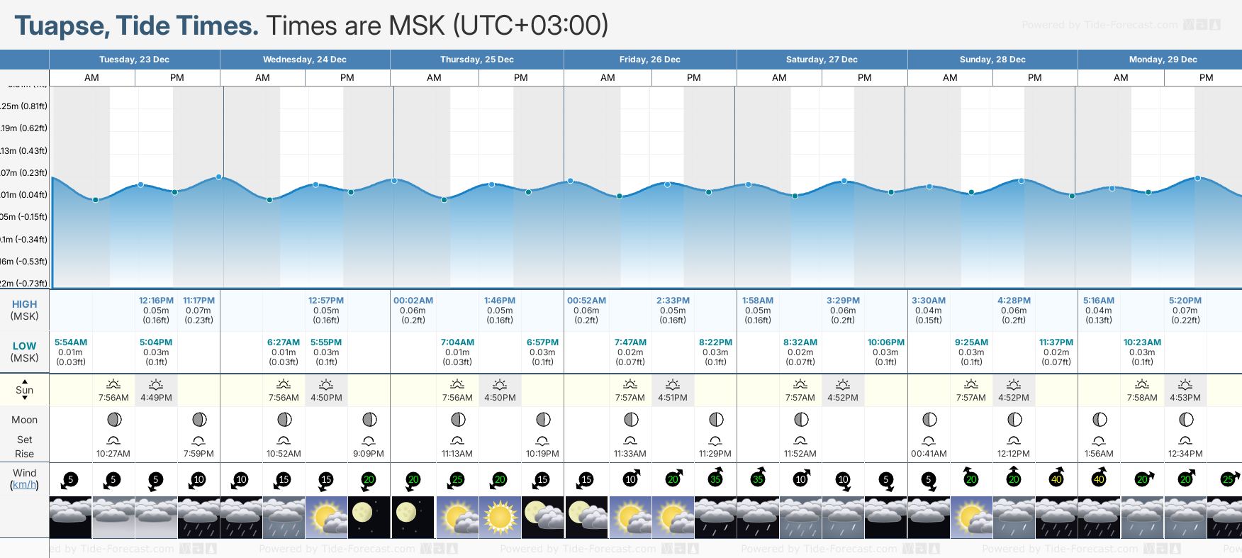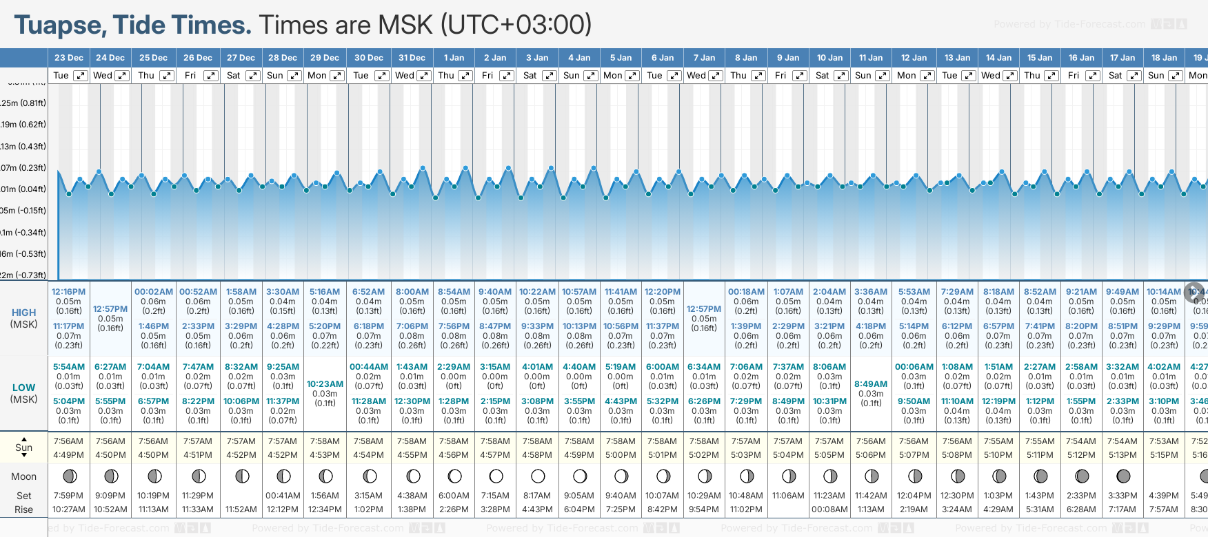 Tide Times are MSK (UTC +3.0hrs). Last Spring High Tide at Tuapse was on Mon 22 Dec (height: 0.07m 0.2ft). Next high Spring Tide at Tuapse will be on Wed 31 Dec (height: 0.08m 0.3ft).
