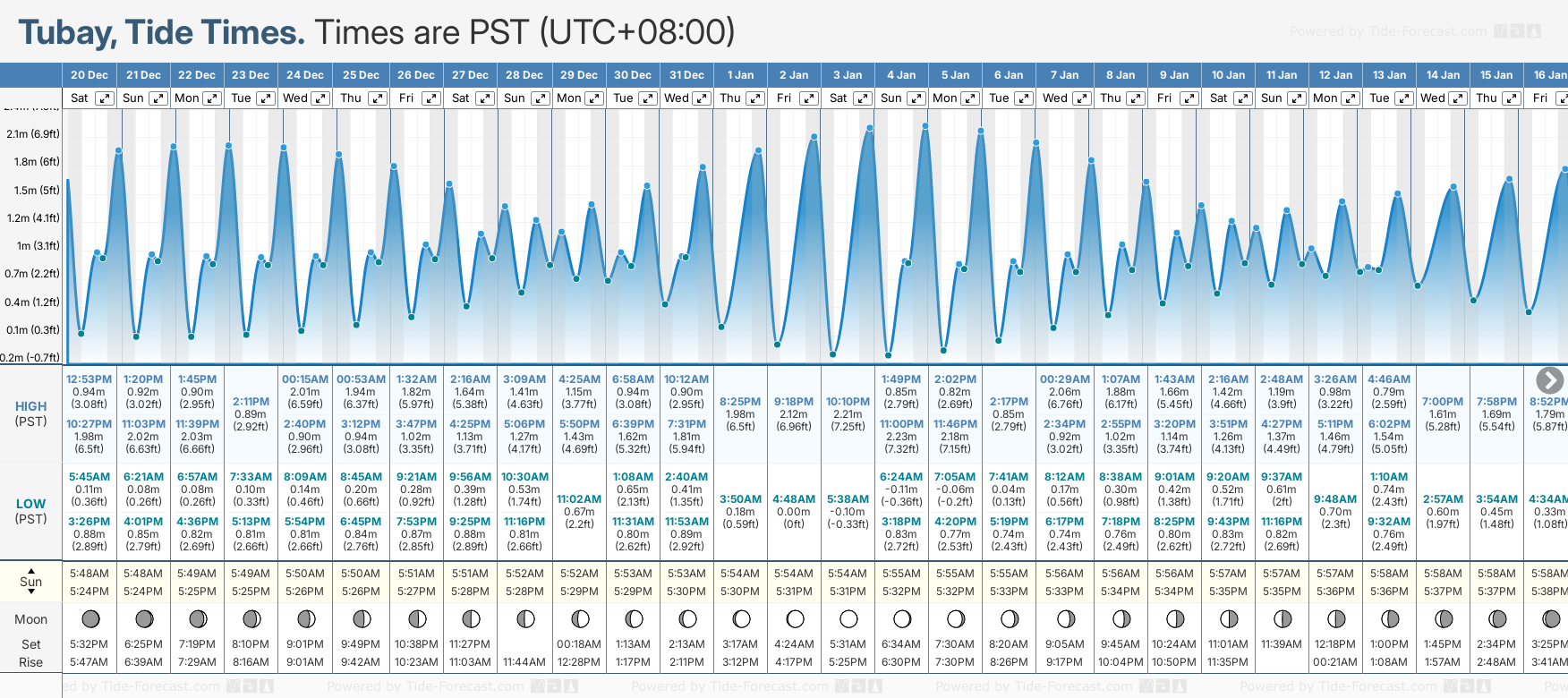 December and January Tide charts for Tubay: The tide charts below show the height, time and date of high and low tides for the next 30 days.