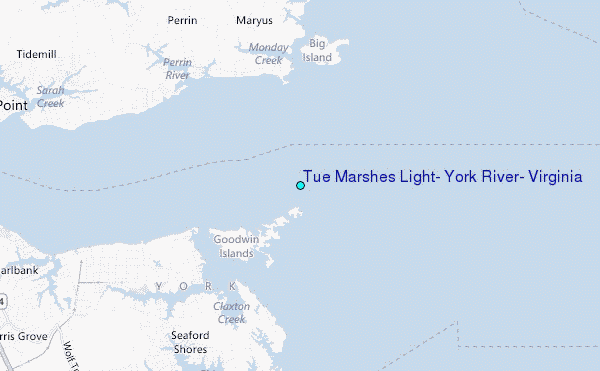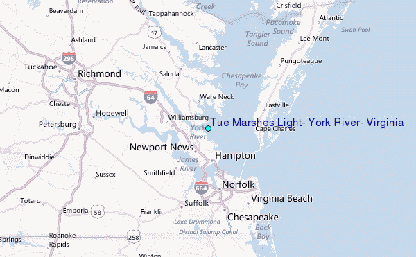 Use this relief map to navigate to tide stations, surf breaks and cities that are in the area of Tue Marshes Light, York River, Virginia.
