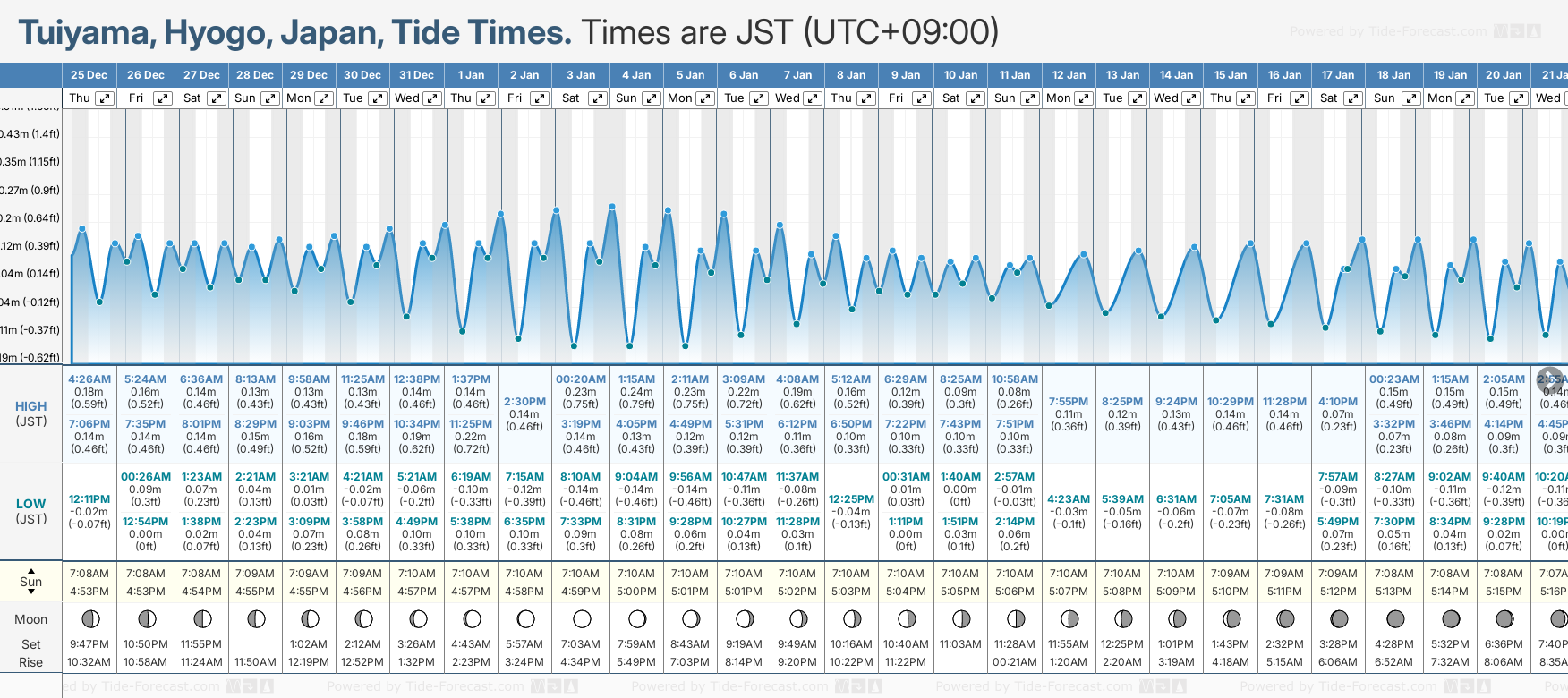 December and January Tide charts for Tuiyama: The tide charts below show the height, time and date of high and low tides for the next 30 days.