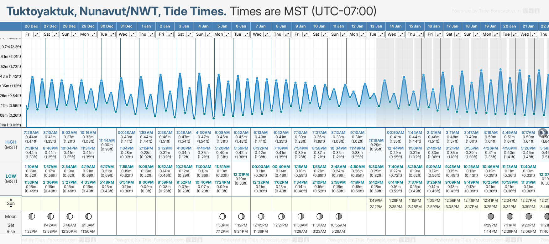 December and January Tide charts for Tuktoyaktuk: The tide charts below show the height, time and date of high and low tides for the next 30 days.