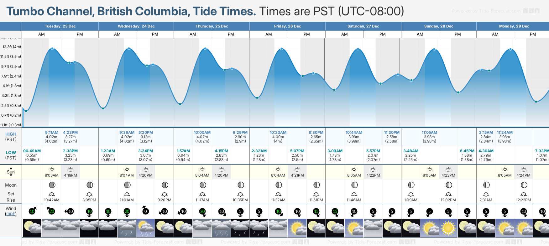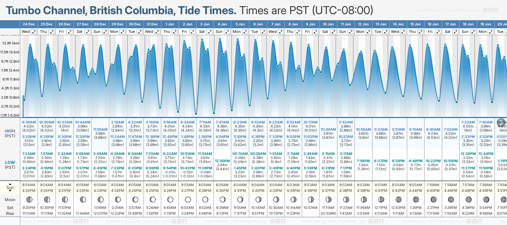 Tide Times are PST (UTC -8.0hrs). Last Spring High Tide at Tumbo Channel was on Fri 19 Dec (height: 4.05m 13.3ft). Next high Spring Tide at Tumbo Channel will be on Sat 03 Jan (height: 4.36m 14.3ft).