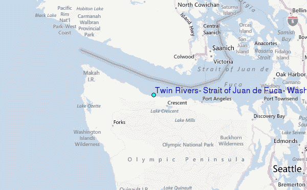 Use this relief map to navigate to tide stations, surf breaks and cities that are in the area of Twin Rivers, Strait of Juan de Fuca, Washington.