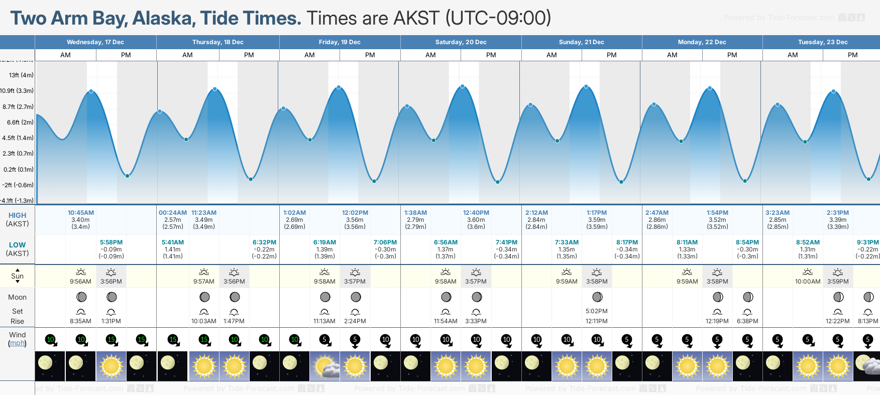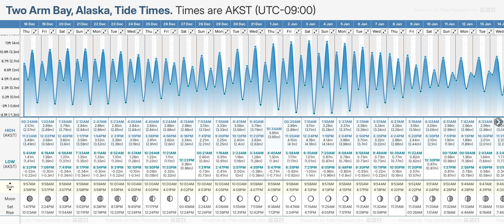 Tide Times are AKST (UTC -9.0hrs). Last Spring High Tide at Two Arm Bay was on Fri 05 Dec (height: 4.37m 14.3ft). Next high Spring Tide at Two Arm Bay will be on Sat 20 Dec (height: 3.60m 11.8ft).