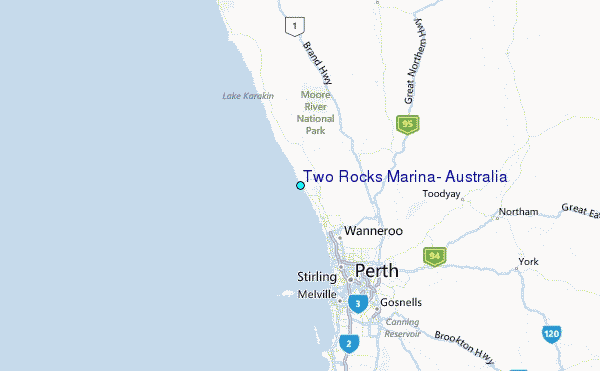 Use this relief map to navigate to tide stations, surf breaks and cities that are in the area of Two Rocks Marina, Australia.