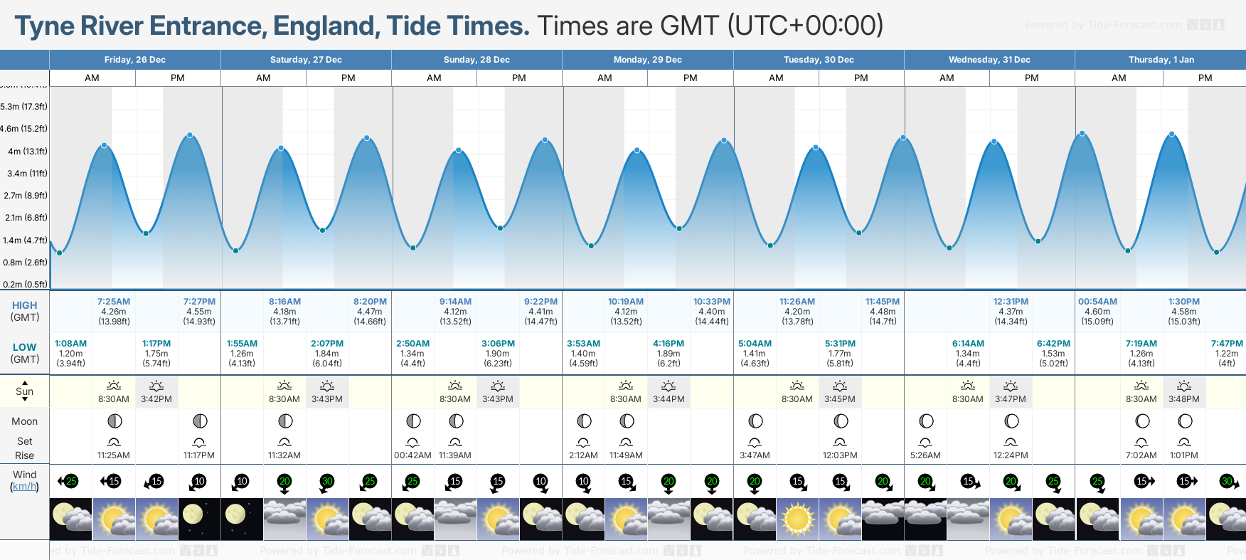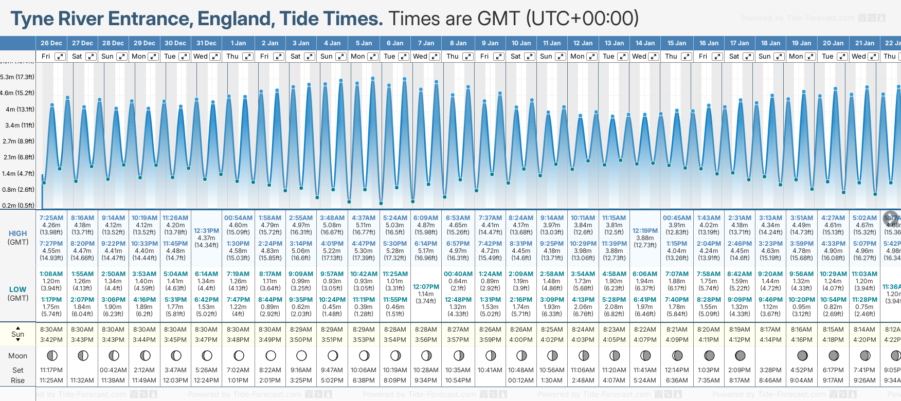 December and January Tide charts for Tyne River Entrance: The tide charts below show the height, time and date of high and low tides for the next 30 days.