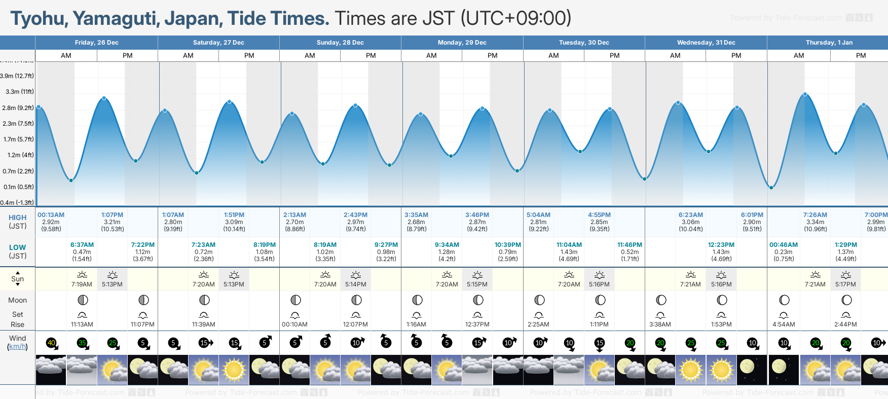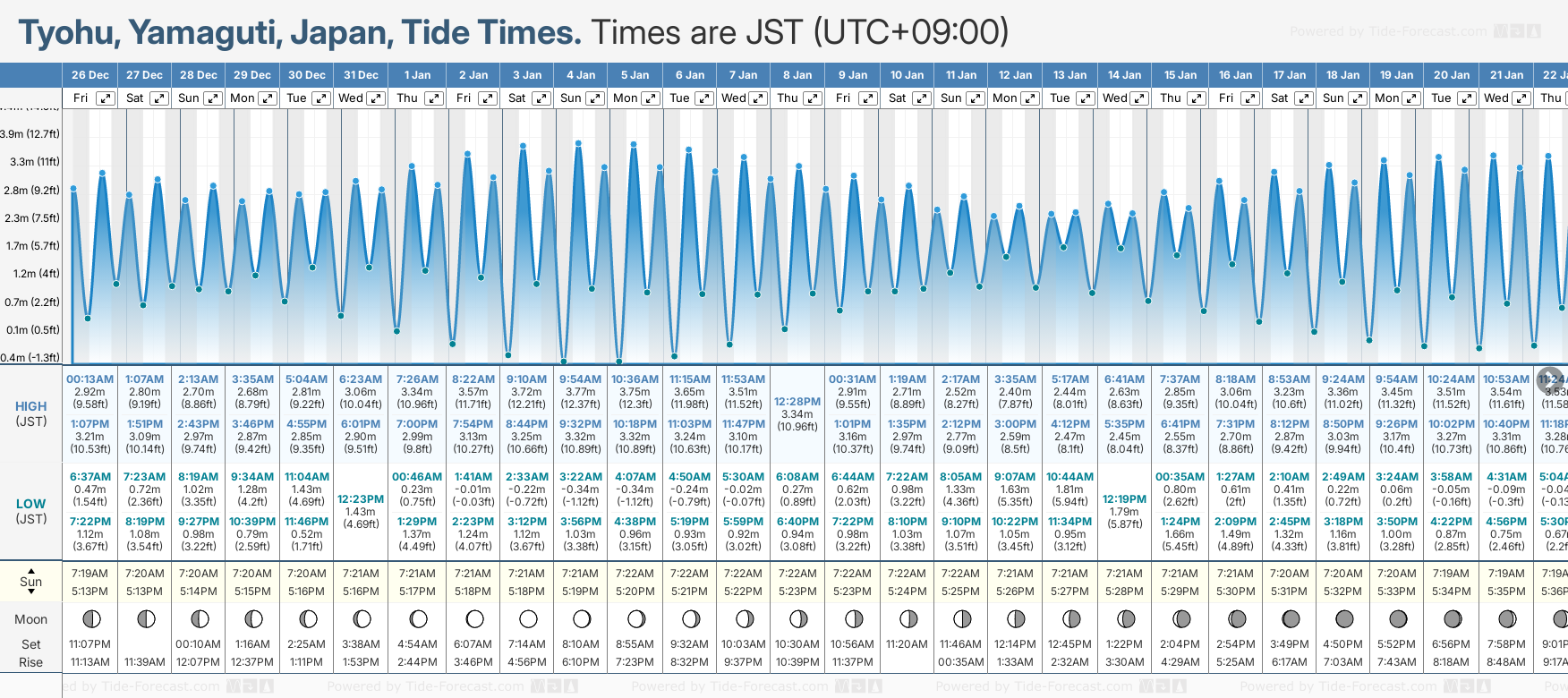 Tide Times are JST (UTC +9.0hrs). Last Spring High Tide at Tyohu was on Mon 22 Dec (height: 3.45m 11.3ft). Next high Spring Tide at Tyohu will be on Sun 04 Jan (height: 3.77m 12.4ft).