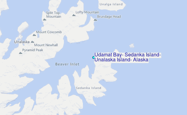 Use this relief map to navigate to tide stations, surf breaks and cities that are in the area of Udamat Bay, Sedanka Island, Unalaska Island, Alaska.