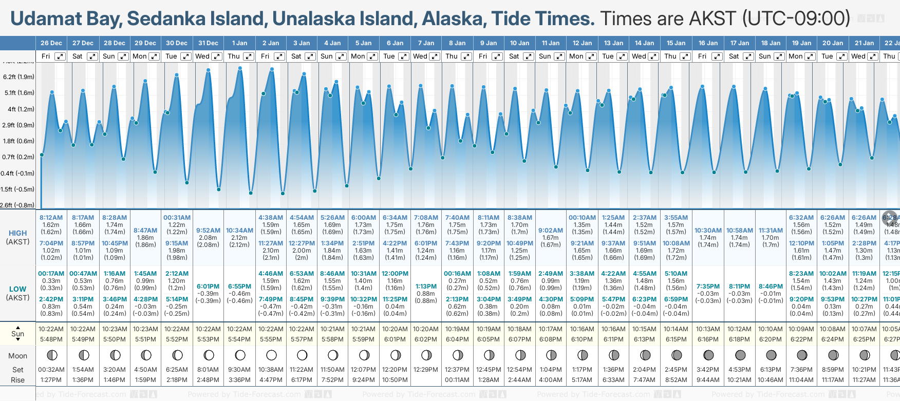Tide Times for Udamat Bay, Sedanka Island, Unalaska Island: Friday 26 December 2025