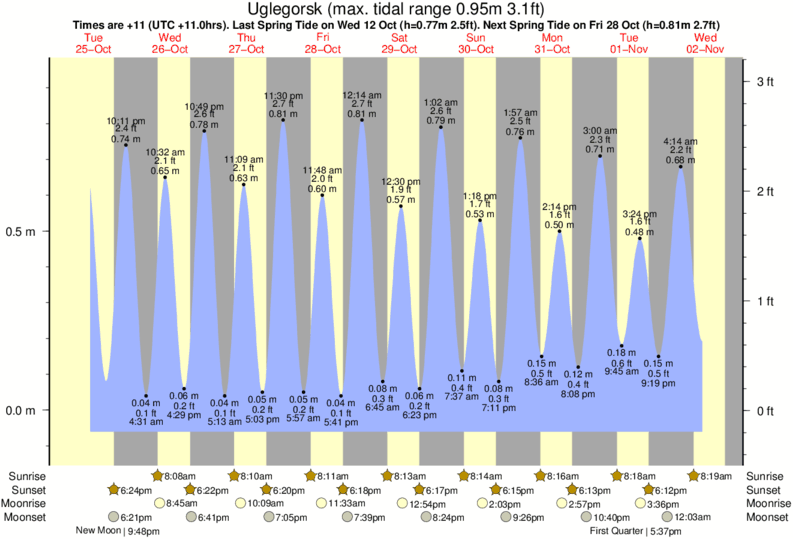 Tide Times are +11 (UTC +11.0hrs). Last Spring High Tide at Uglegorsk was on Sun 07 Dec (height: 0.92m 3.0ft). Next high Spring Tide at Uglegorsk will be on Sun 04 Jan (height: 0.89m 2.9ft).