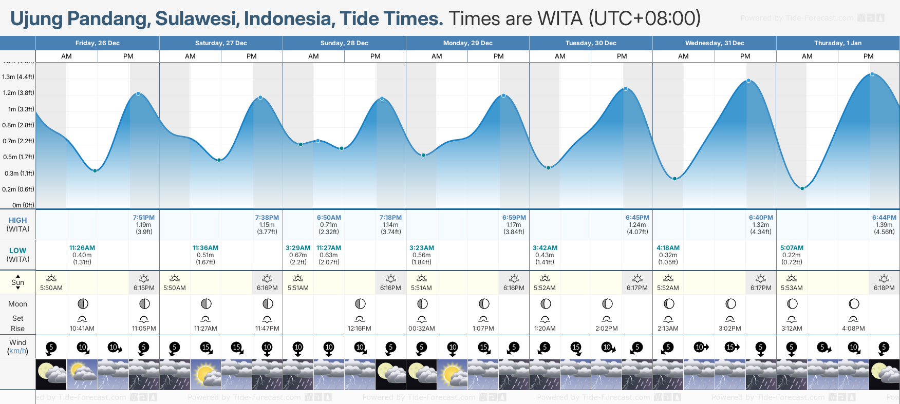 Tide Times are WITA (UTC +8.0hrs). Last Spring High Tide at Ujung Pandang, Sulawesi was on Mon 22 Dec (height: 1.38m 4.5ft). Next high Spring Tide at Ujung Pandang, Sulawesi will be on Sat 03 Jan (height: 1.43m 4.7ft).
