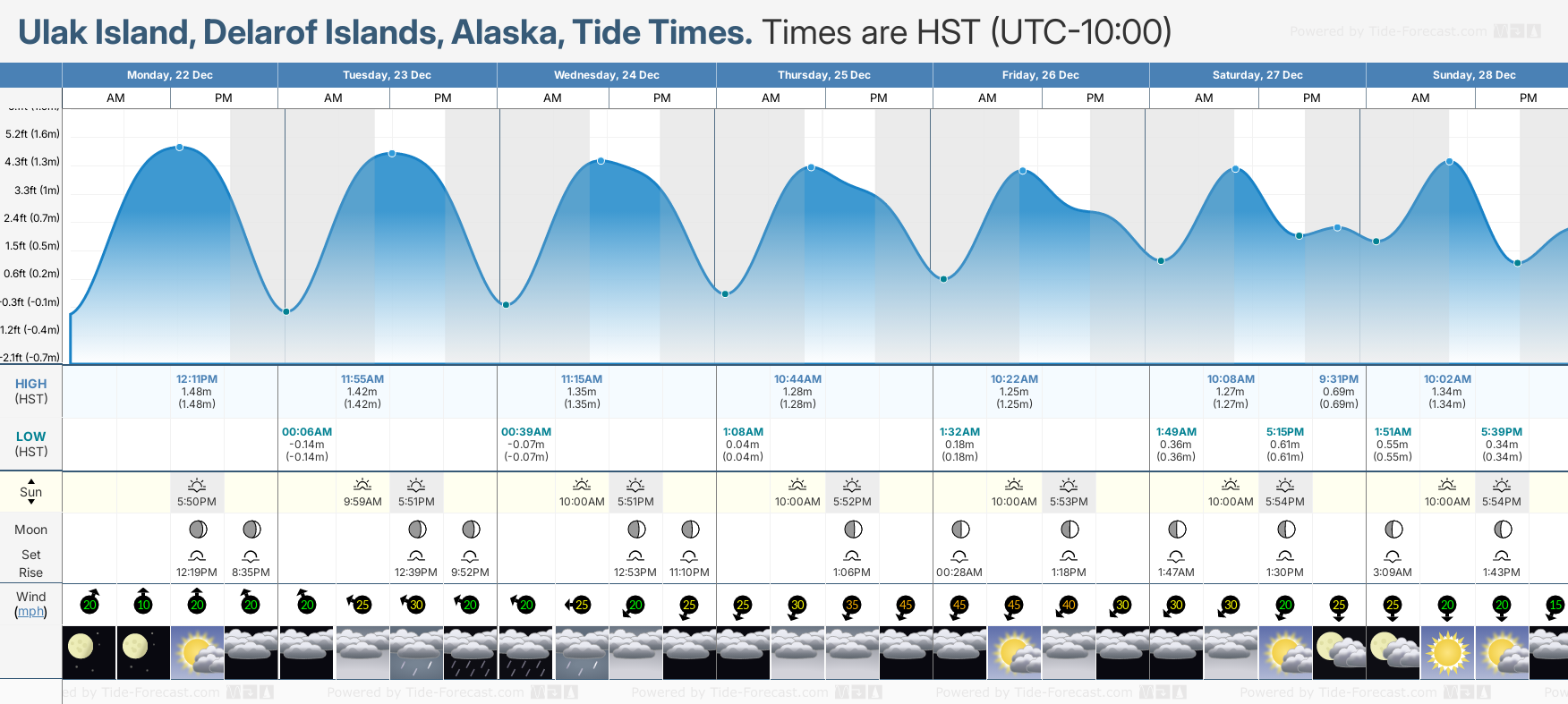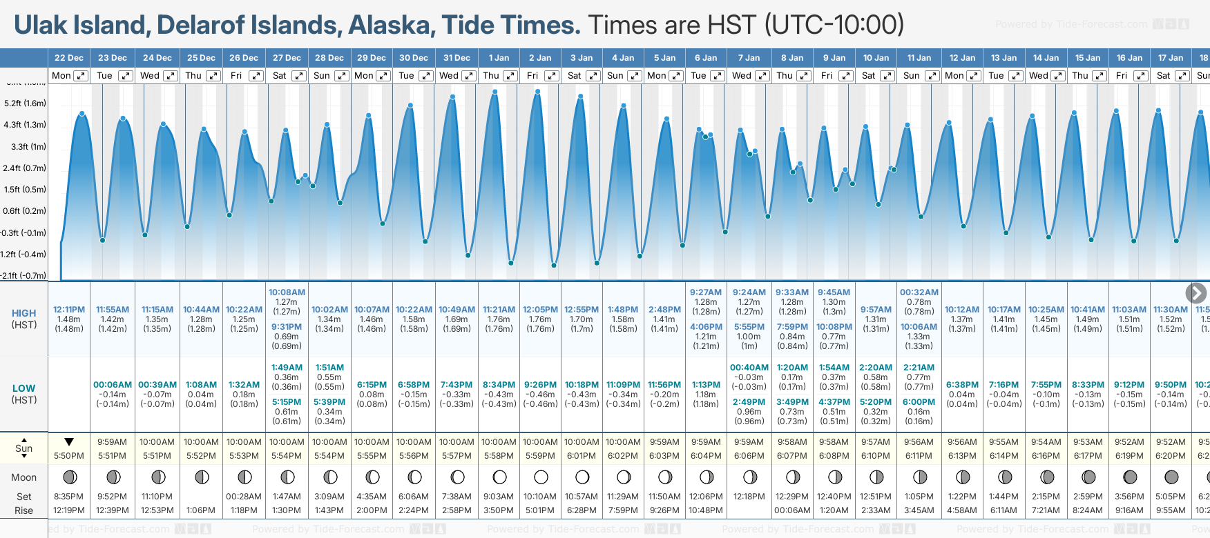 December and January Tide charts for Ulak Island, Delarof Islands: The tide charts below show the height, time and date of high and low tides for the next 30 days.