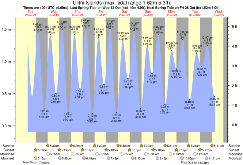 Tide chart for Ulithi IslandsShowing low and high tide times for the next 30 days at Ulithi Islands. Tide Times are +09 (UTC +9.0hrs).
