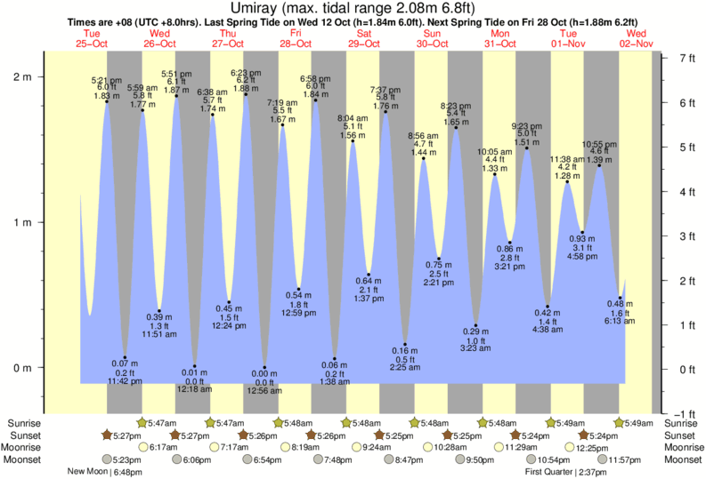 Tide Times are PST (UTC +8.0hrs). Last Spring High Tide at Umiray was on Sat 06 Dec (height: 1.94m 6.4ft). Next high Spring Tide at Umiray will be on Mon 05 Jan (height: 1.92m 6.3ft).