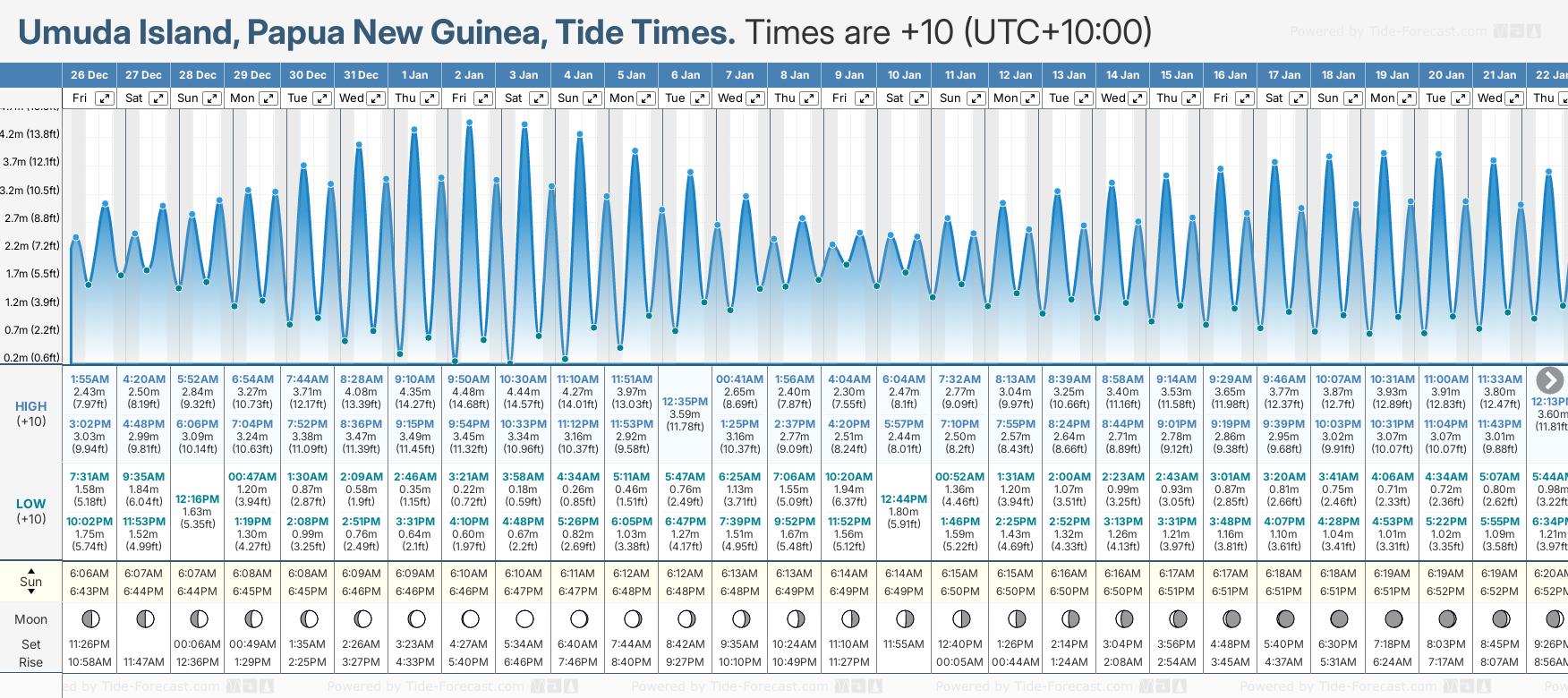 December and January Tide charts for Umuda Island: The tide charts below show the height, time and date of high and low tides for the next 30 days.