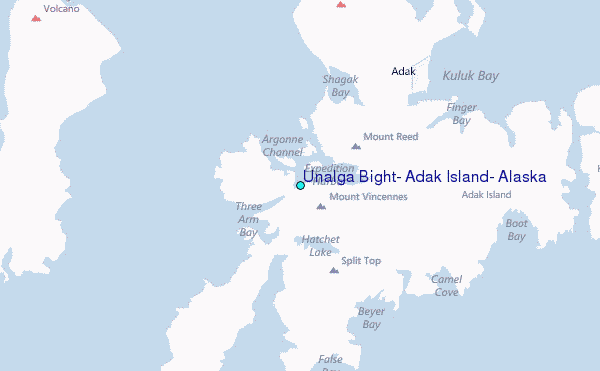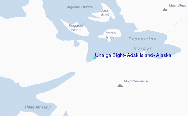 Use this relief map to navigate to tide stations, surf breaks and cities that are in the area of Unalga Bight, Adak Island, Alaska.