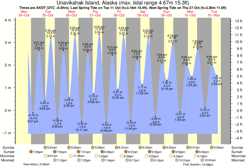 Tide Times are AKST (UTC -9.0hrs). Last Spring High Tide at Unavikahak Island was on Fri 05 Dec (height: 3.69m 12.1ft). Next high Spring Tide at Unavikahak Island will be on Sat 20 Dec (height: 3.13m 10.3ft).