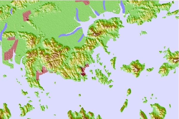 Use this relief map to navigate to tide stations, surf breaks and cities that are in the area of Uno, Okayama, Japan.